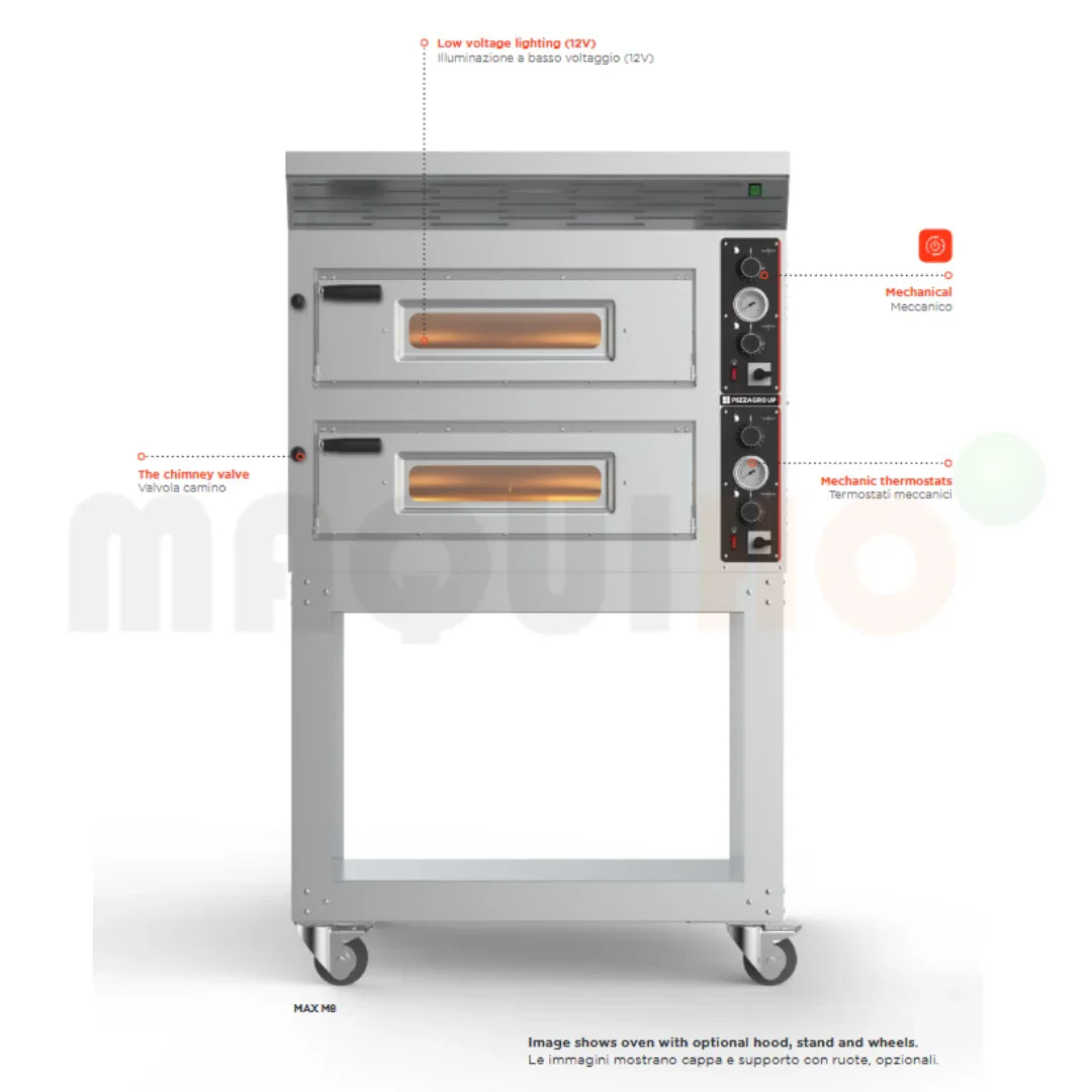Modelos mono-cámara (4 y 6) y doble cámara (8 y 12). Los hornos mono-cámara pueden superponerse dos unidades. Superficie de cocción con ladrillo refractario. Resistencias en parte superior e inferior. Frente, sobre y puertas con cristal en acero inox. Termómetro analógico, luz interior y aislamiento térmico. Interruptor puesta en marcha. Capacidad pizzas por cámara: Máx. 6x33 cm / Máx. 2x45 cm / Máx. 2x(60x40) cm. Temperatura de trabajo: 400ºC Máx. Alimentación: 400 3 Ph 50 Hh. Potencia absorbida: 14,60 Kw. Nº de cámaras: 2. Dimensiones cámara: 700x1050x150 mm. Dimensiones externas: 990x1270x680 mm.